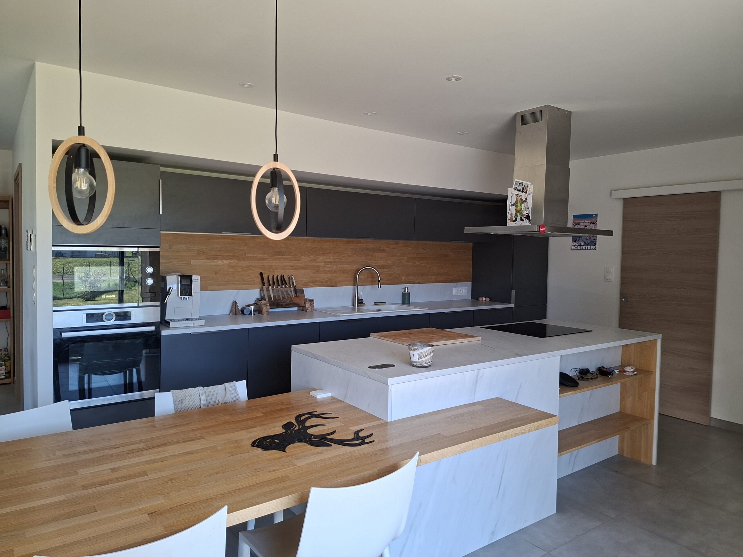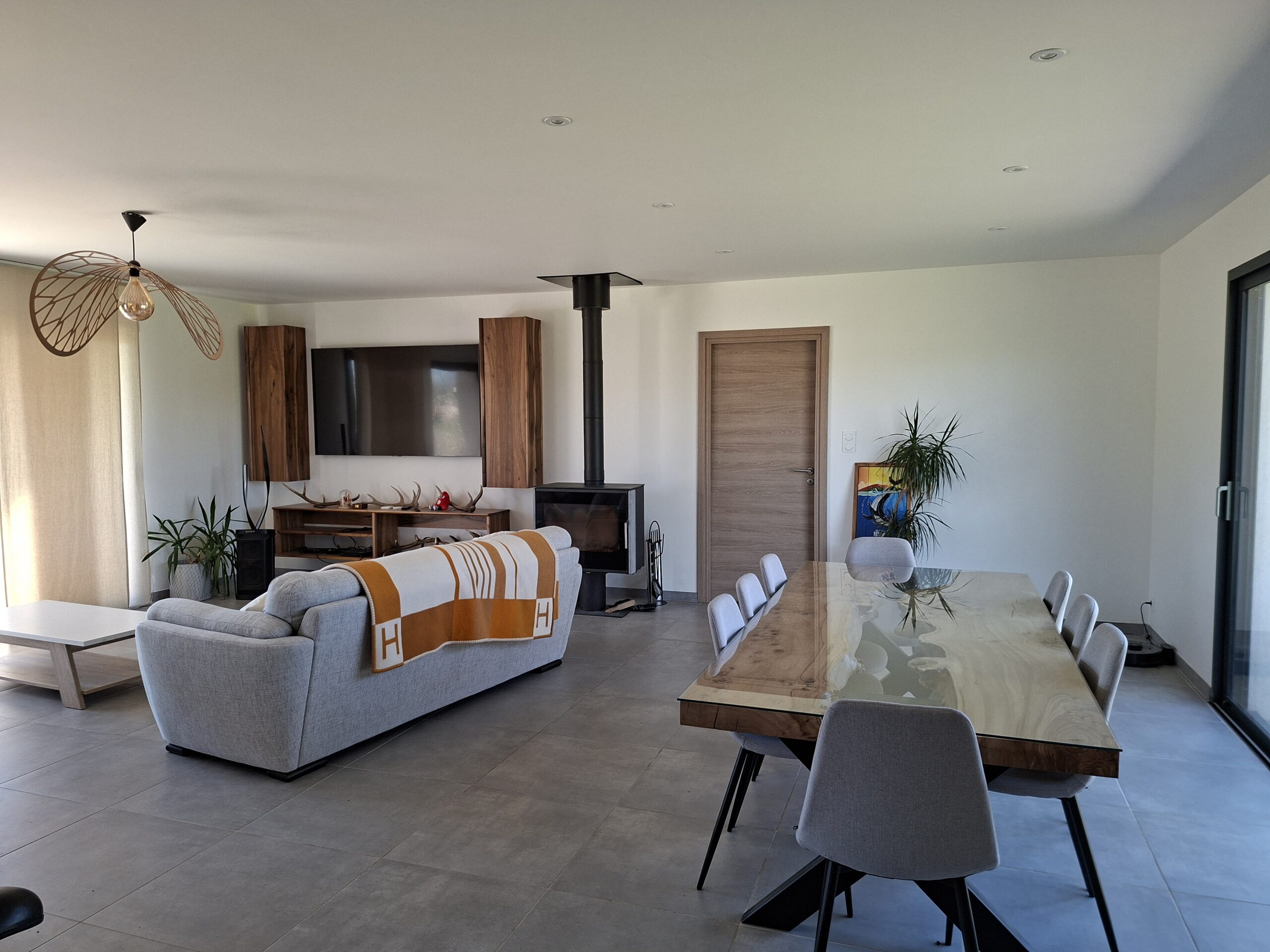 Le système de chauffage est composé d’un plancher chauffant avec une pompe à chaleur et d’un poêle à bois.